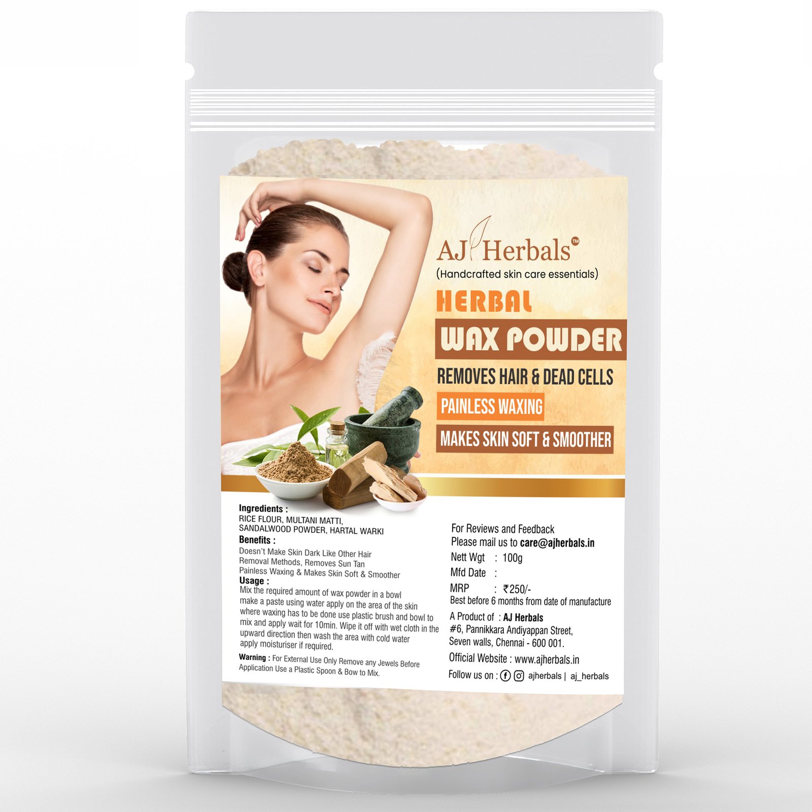 Our herbal wax powder is a simple, easy, pain-free, and affordable solution for removal of even the smallest of hair at home without any side effects. It also consists of rice flour which helps to make your skin smooth after hair removal Multani mitti (Fullers earth) helps to De-tan How to use: 1. Mix it 2. Apply it 3. Leave it on for 7-10 mins 4. Wipe off with wet cloth