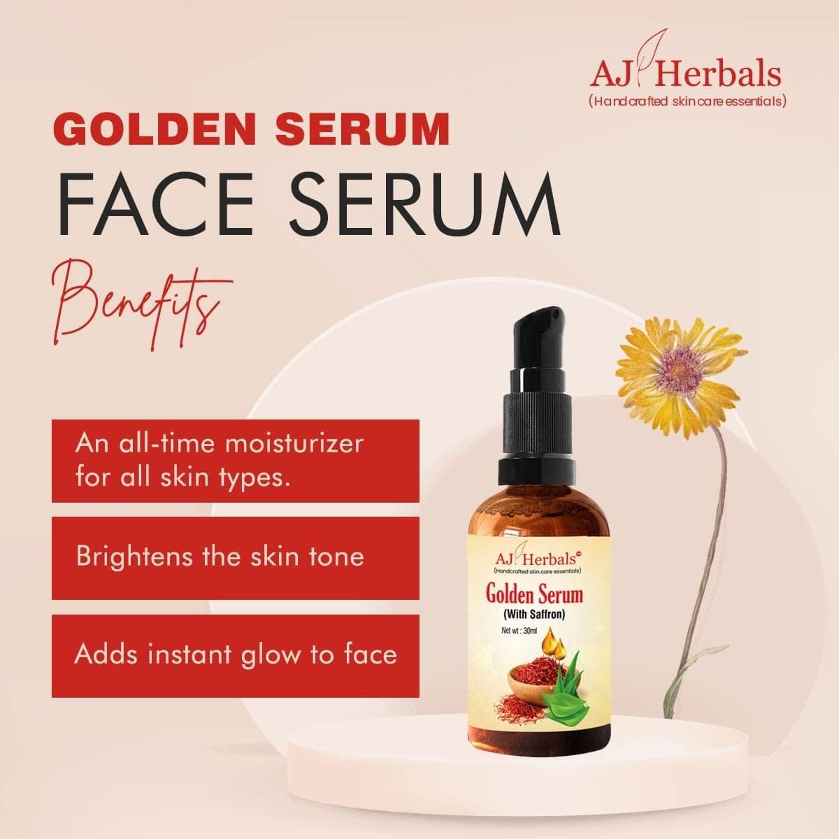 AJ HERBALS GOLDEN SERUM with best Iranian saffron gives instant glow and brightness to the skin. This serum gives amazing effects on skin tone. First grade Iranian saffron has been used. to boost complexion. Tea tree oil helps a lot in giving a flawless skin. Added rose essential oil too for it’s own therapeutic use. Usage: * Clean your face with a mild cleanser. * Pat it dry. * Apply 4 to 5 drops of the serum and gently massage all around your face.